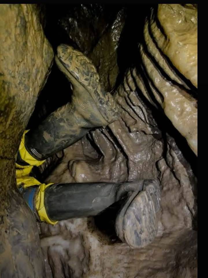 Ben y yo continuamos, mientras yo me encajaba firmemente como siempre. Ben se coló con facilidad y revisó la última cámara para ver si valía la pena abrirme paso, pero (por suerte) no hubo recompensas que compensaran el esfuerzo y las costillas magulladas, así que nos reunimos con el grupo para tomar algunas fotos. Convencí a Ben y Loz de que se quedaran en la poza del fondo de la cámara para una última foto antes de regresar.